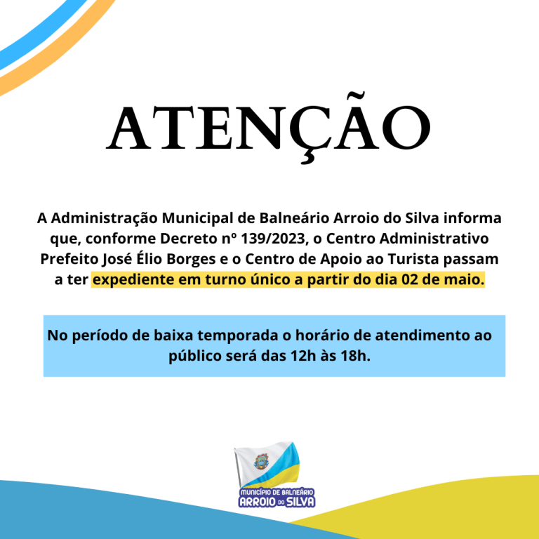 A Administração Municipal de Balneário Arroio do Silva anunciou que, em conformidade com o Decreto nº 139/2023, o Centro Administrativo Prefeito José Élio Borges e o Centro de Apoio ao Turista adotarão expediente em turno único a partir de 2 de maio.